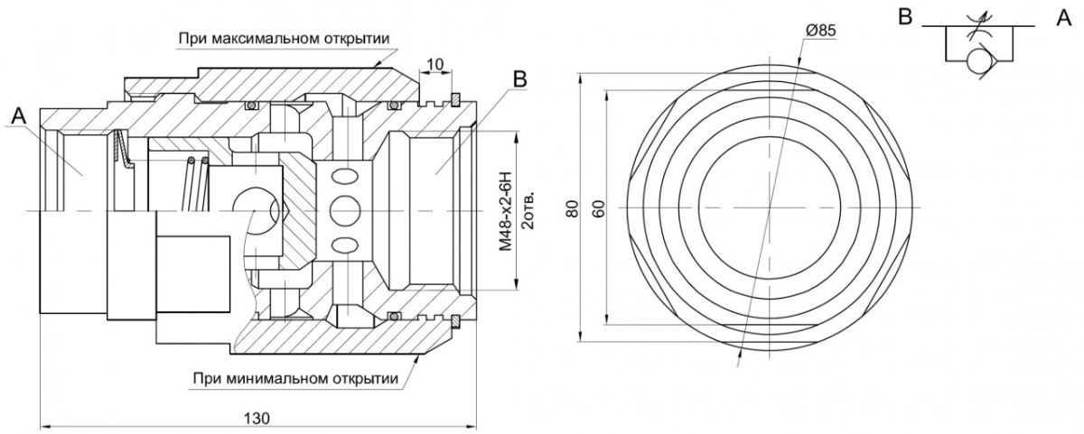 При направлении потока от А к В рабочая жидкость проходит через дроссель, а при направлении от В к А — через обратный гидроклапан. Поток регулируется изменением рабочего сечения окон дросселя при вращении поворотного корпуса. При подсоединении дросселя применять кольца 046-050-25-2-3 ГОСТ 18829-73 и штуцеры с присоединительными размерами по ГОСТ 9833-73.